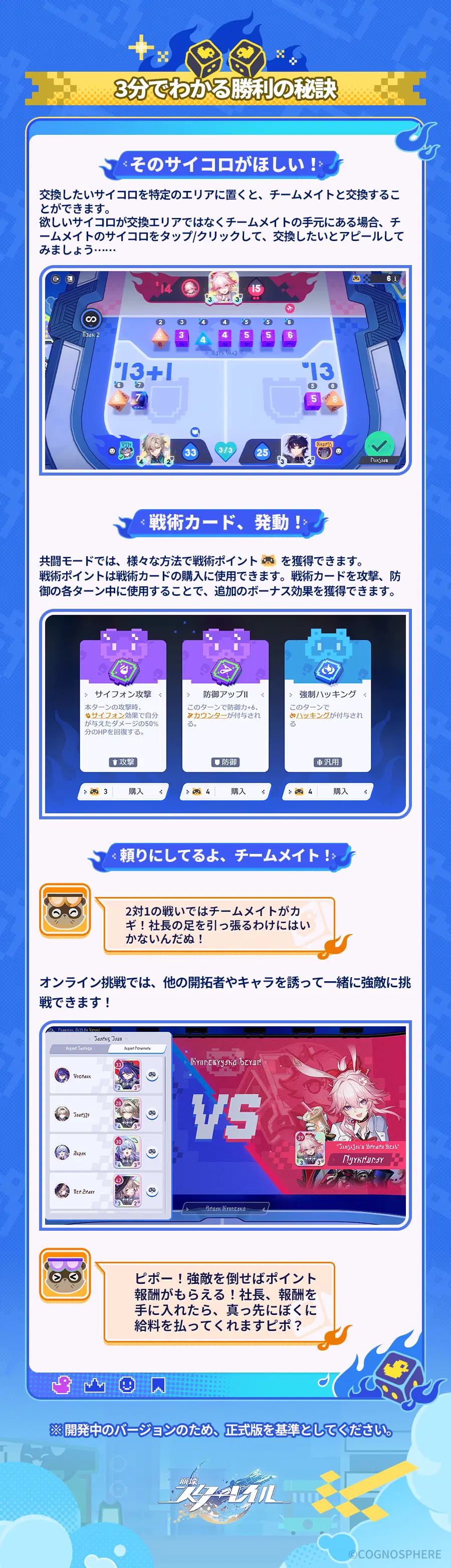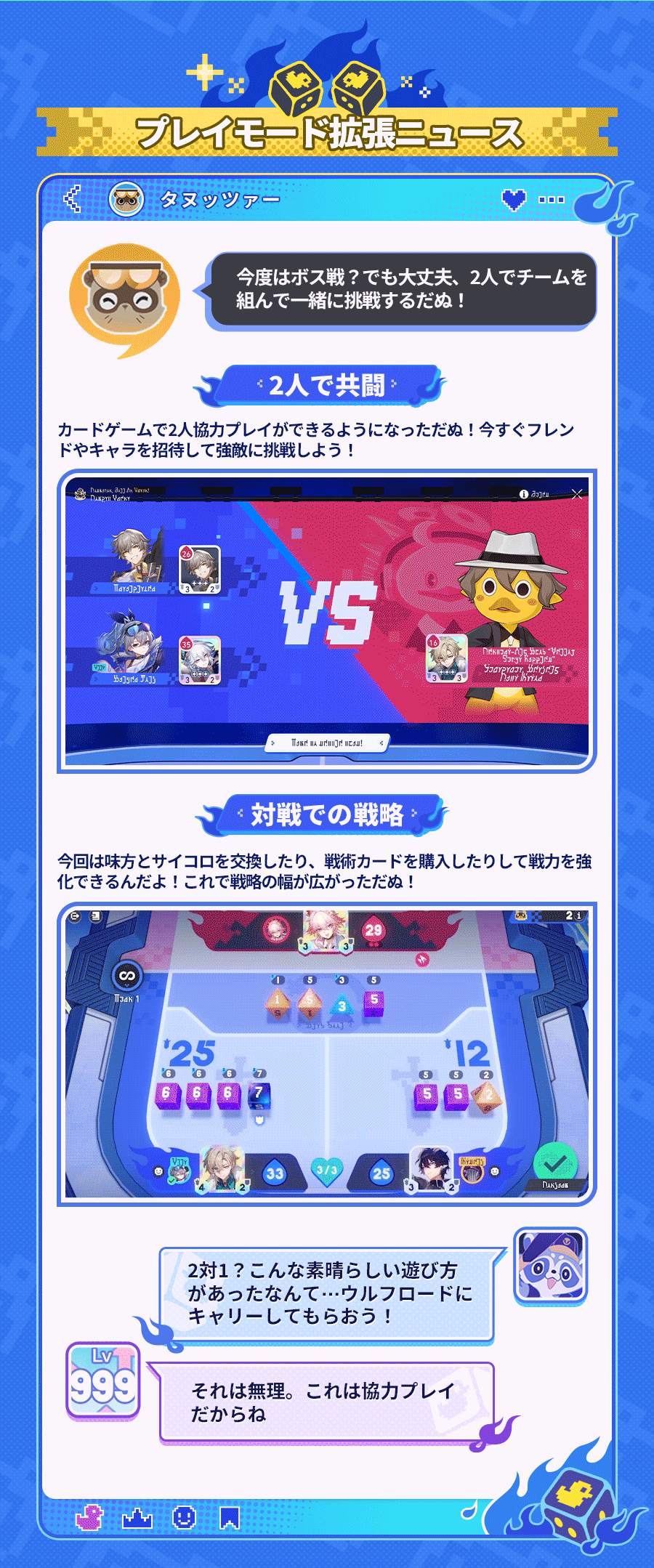 イベント期間中、「コズミック・フォース」は2対1の共闘モードで進行します。開拓者は銀狼と一緒に、集めたキャラクターカードを使って対戦相手と戦い、カードについているサイコロで攻撃と防御を行います。