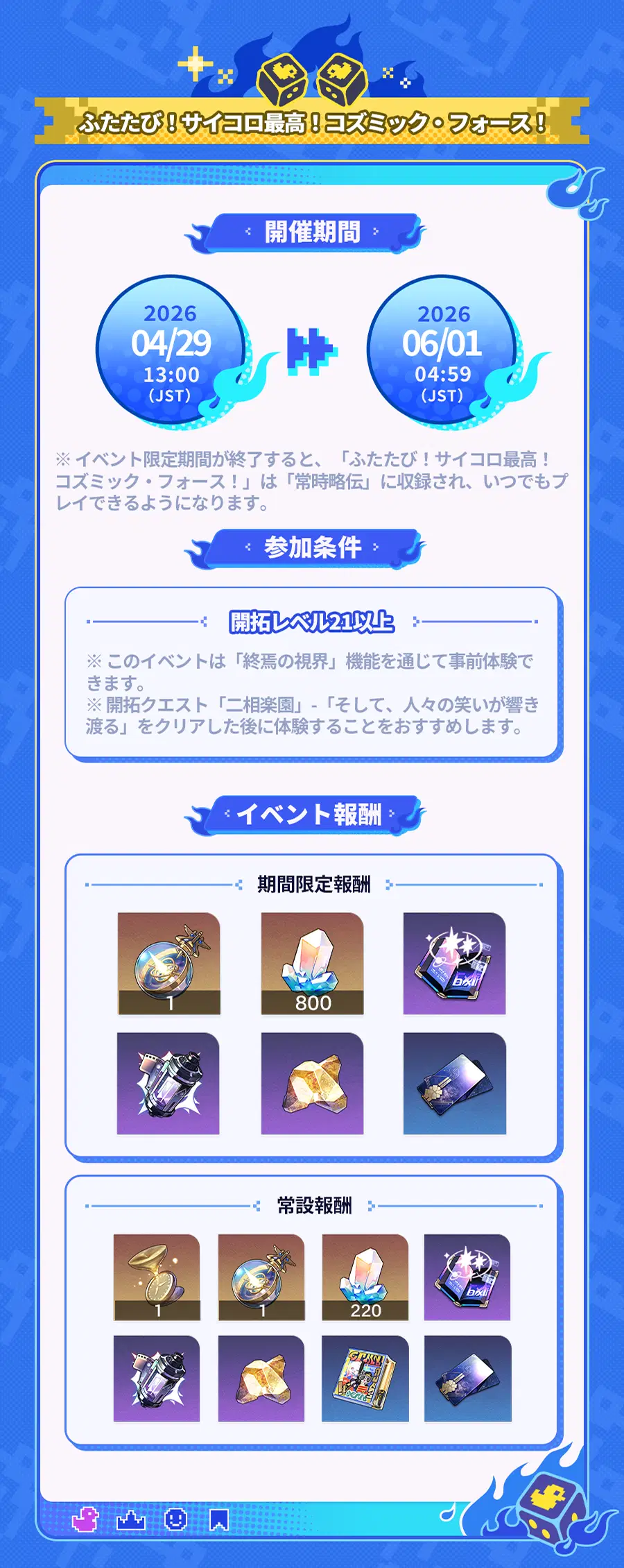 期間限定イベント「ふたたび!サイコロ最高!コズミック・フォース!」終了後、期間限定報酬は獲得できなくなります。ただし、マップ「海原市」で「化け太子」と会話することで、引き続きコンテンツを体験したり、常設報酬を獲得したりすることができます。