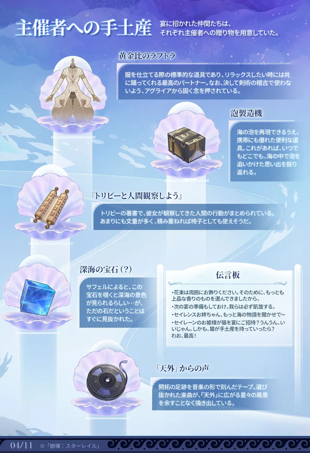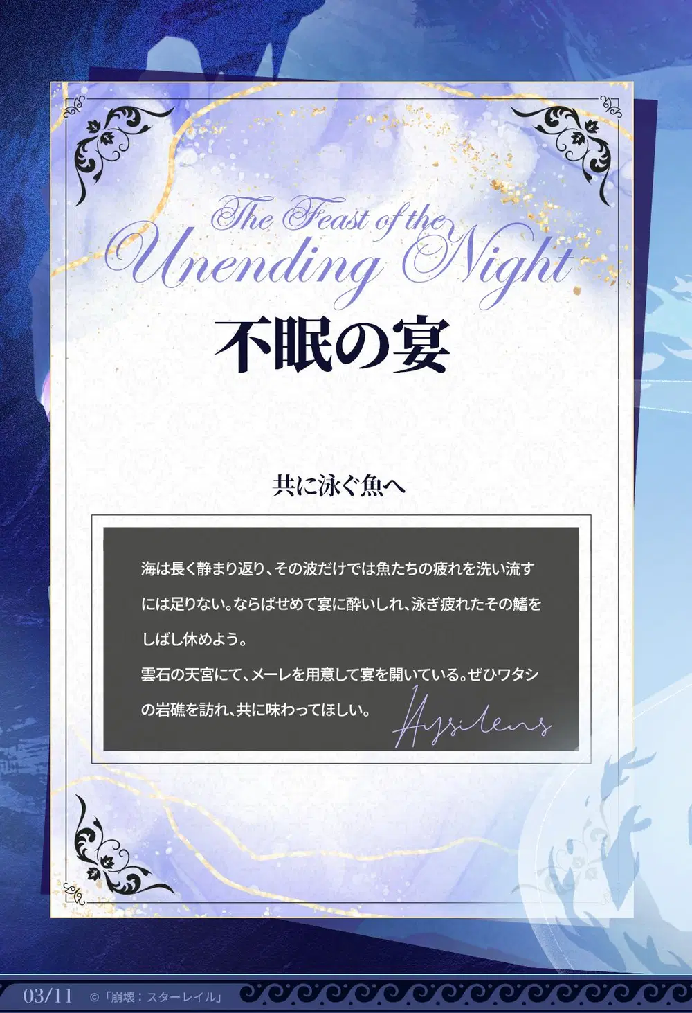 「『タイタンの末裔』だろうと、人間だろうと魚だろうと…少なくともこの酔いが覚めるまでは、ワタシたちはまだすべてを手にしているのだ。さあ、杯を上げ、この夜を思う存分味わおう」