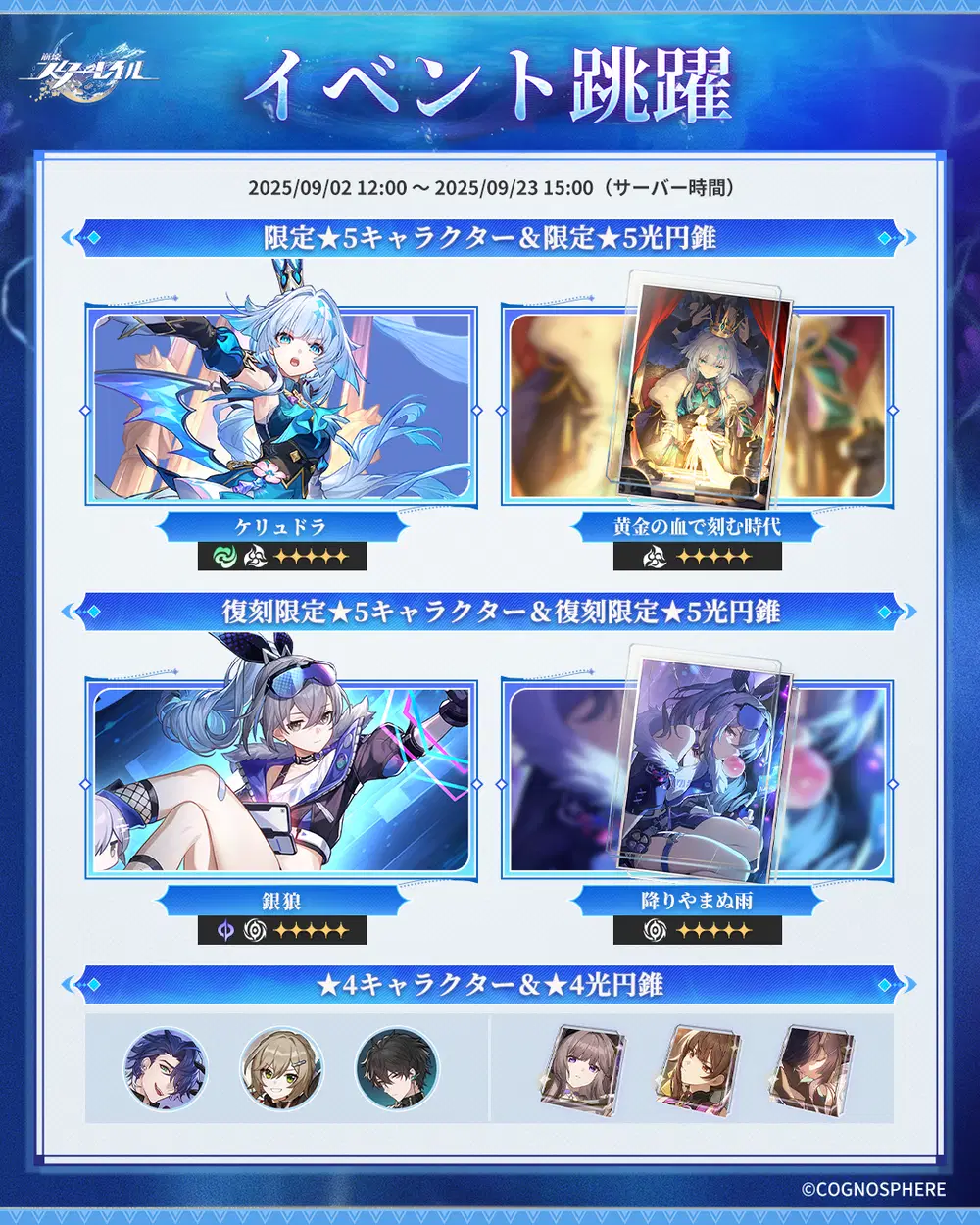 ※ イベント跳躍期間中、限定★5キャラクター「ケリュドラ(調和・風)」はイベント跳躍・キャラクター「潮を征する鉄血」でのみ獲得できます。同様に、限定★5キャラクター「銀狼(虚無・量子)」はイベント跳躍・キャラクター「零号協定」でのみ獲得できます。