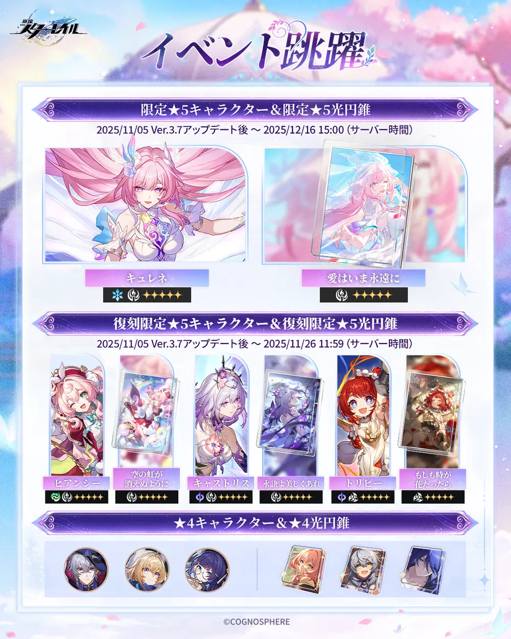 ● イベント跳躍・光円錐「真心の集・永訣よ美しくあれ」期間中、限定★5光円錐「永訣よ美しくあれ(記憶)」、および★4光円錐「物語をめくって(記憶)」「二人だけのコンサート(存護)」「終わりなき舞踏(虚無)」の出現率が期間限定でアップします。