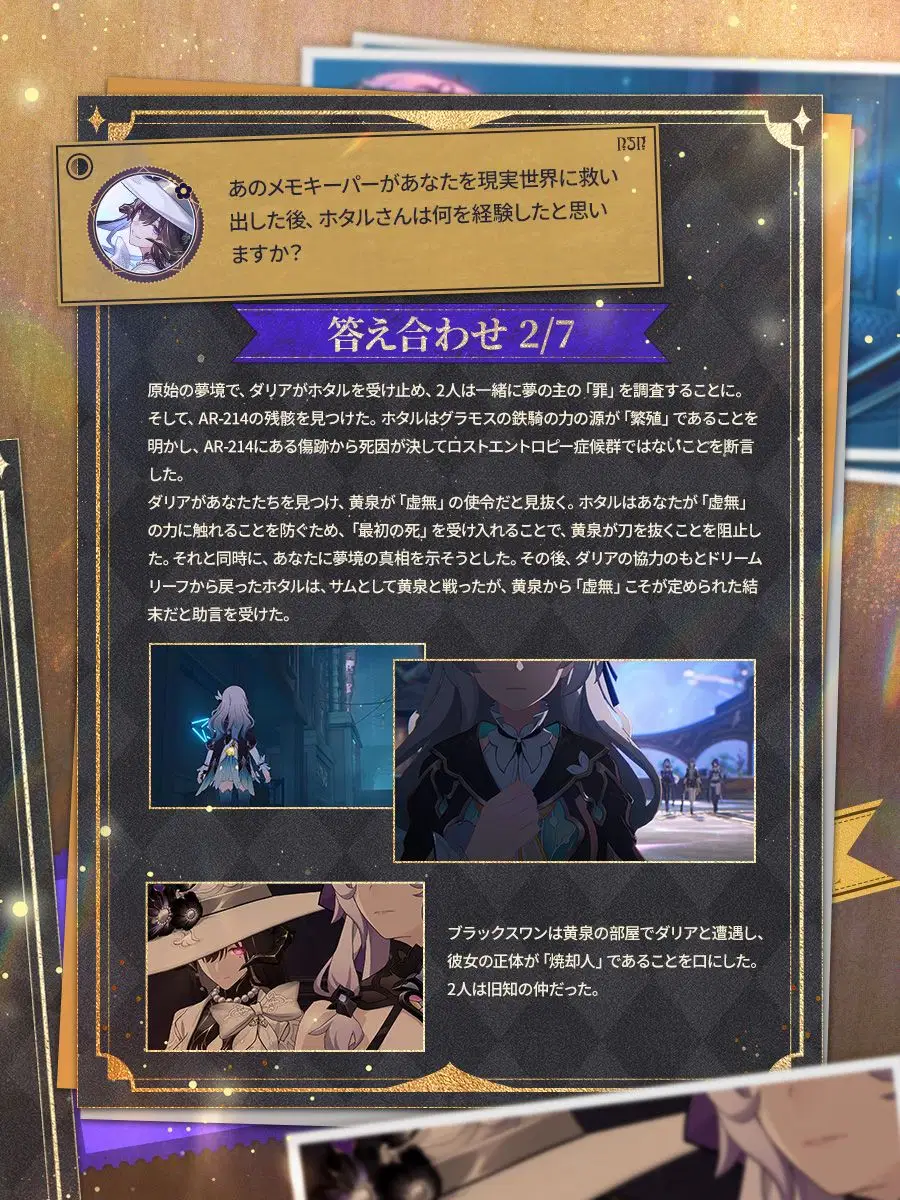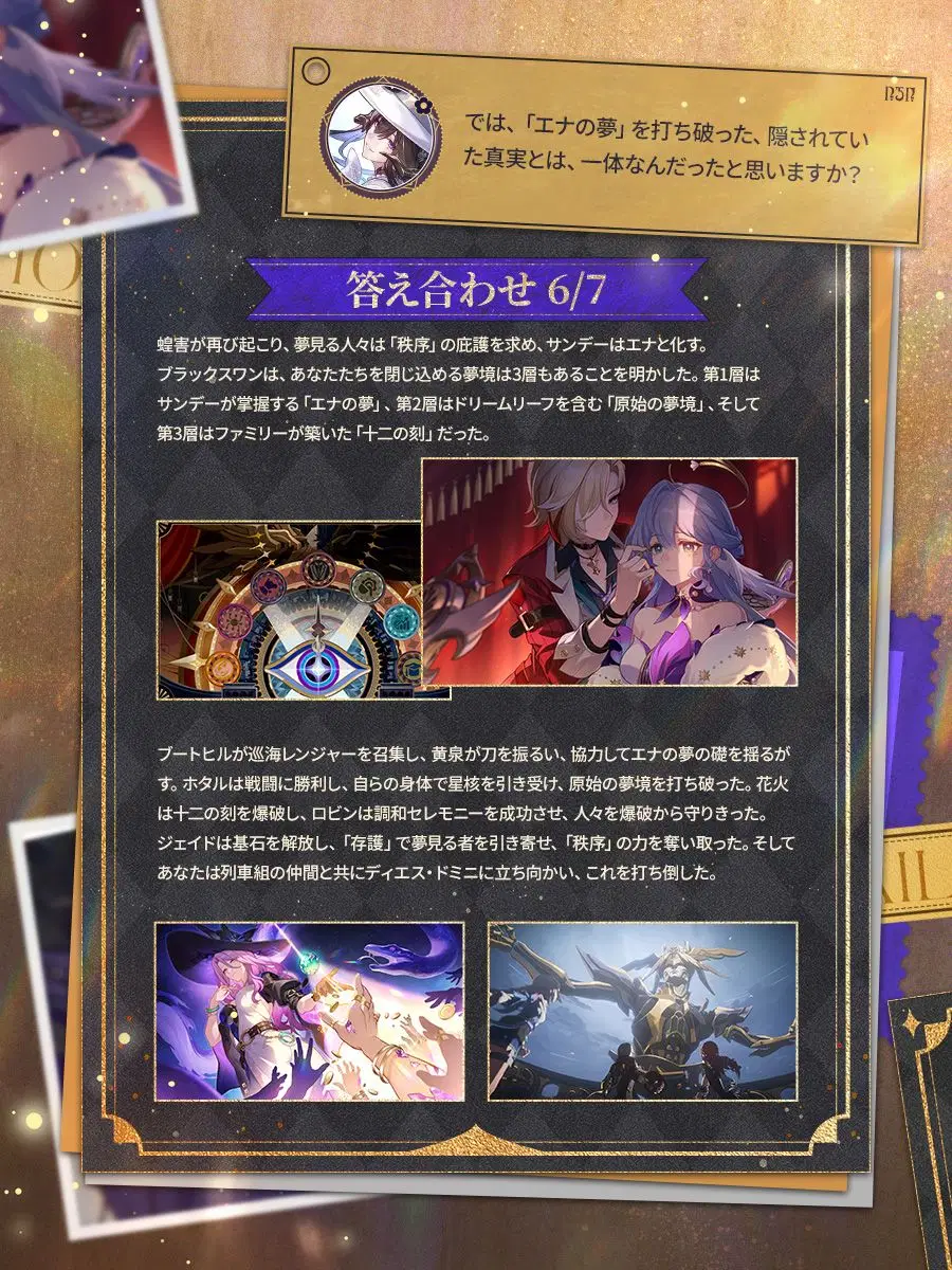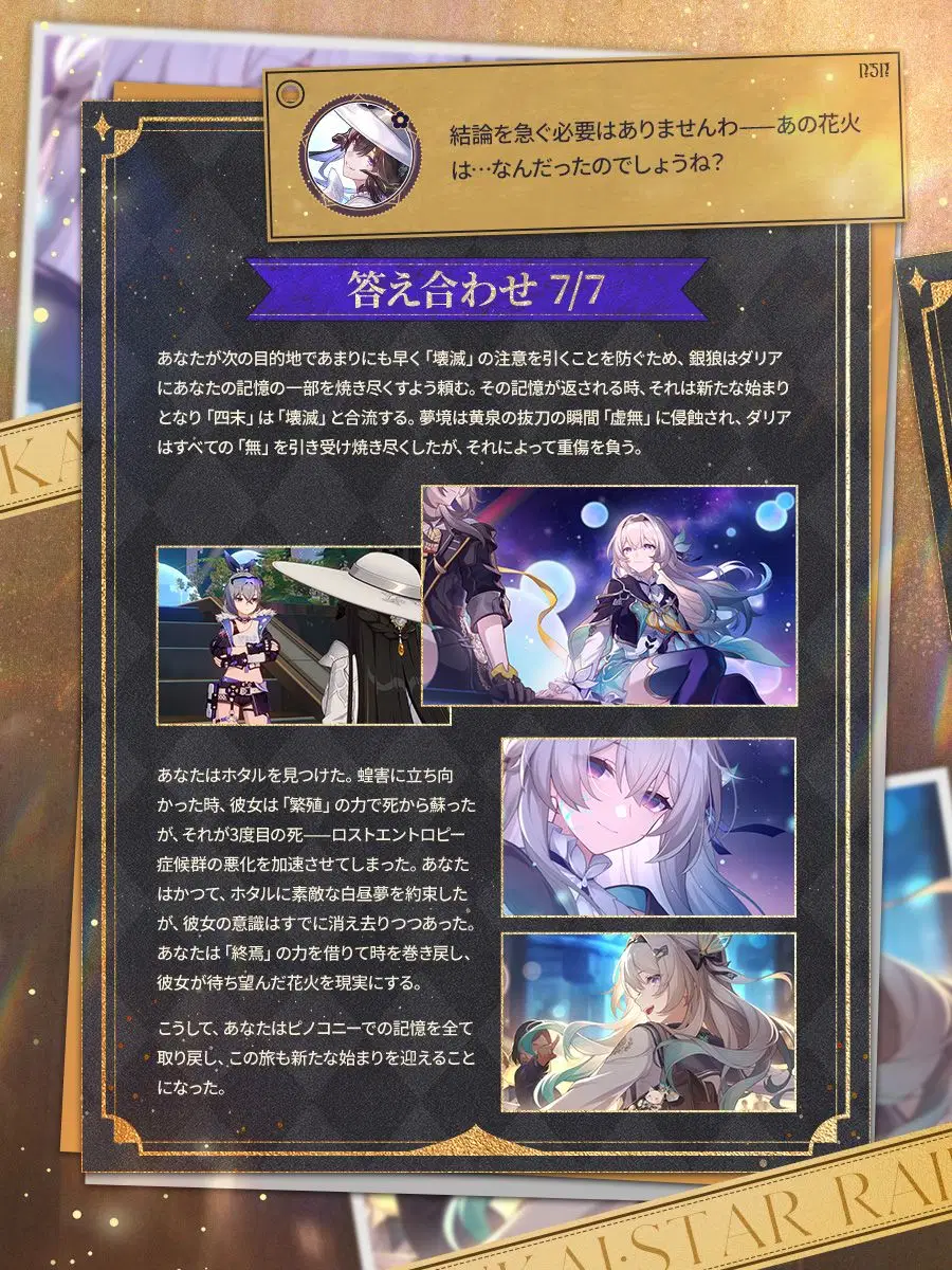 「あなたは時を動かし、そこに意味を与えられる人。運命を変え、無念を晴らせる人」 彼女は約束の通り、あなたを呼び起こす——さあ、運命の時針を動かし、失われた記憶に新たなプロローグを書き記しましょう。 ※ Ver.3.8終焉クエストのクリア後に閲覧することをおすすめします。