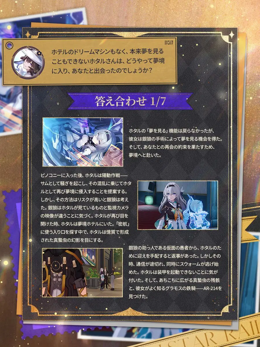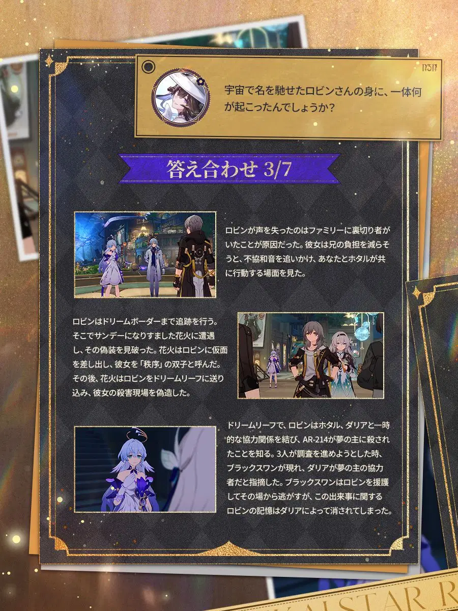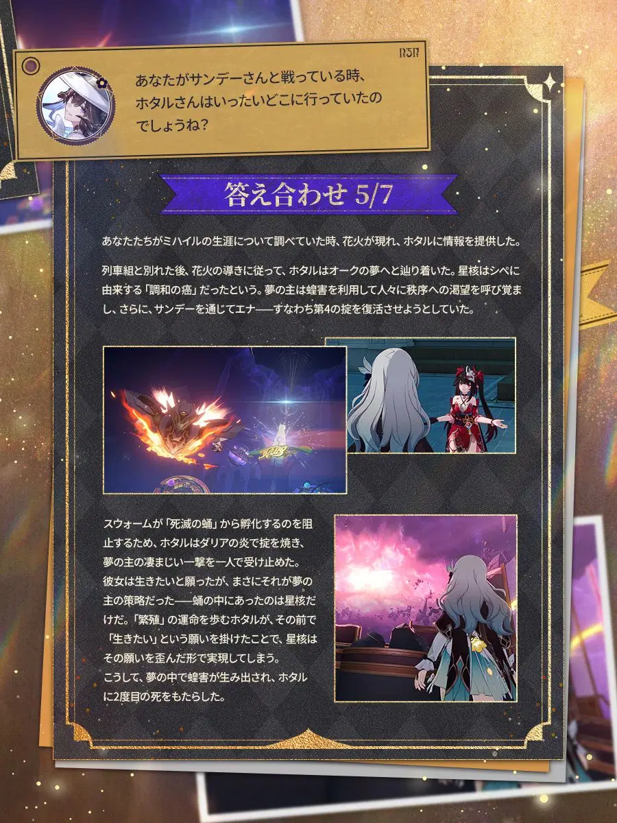 「あなたは時を動かし、そこに意味を与えられる人。運命を変え、無念を晴らせる人」 彼女は約束の通り、あなたを呼び起こす——さあ、運命の時針を動かし、失われた記憶に新たなプロローグを書き記しましょう。 ※ Ver.3.8終焉クエストのクリア後に閲覧することをおすすめします。