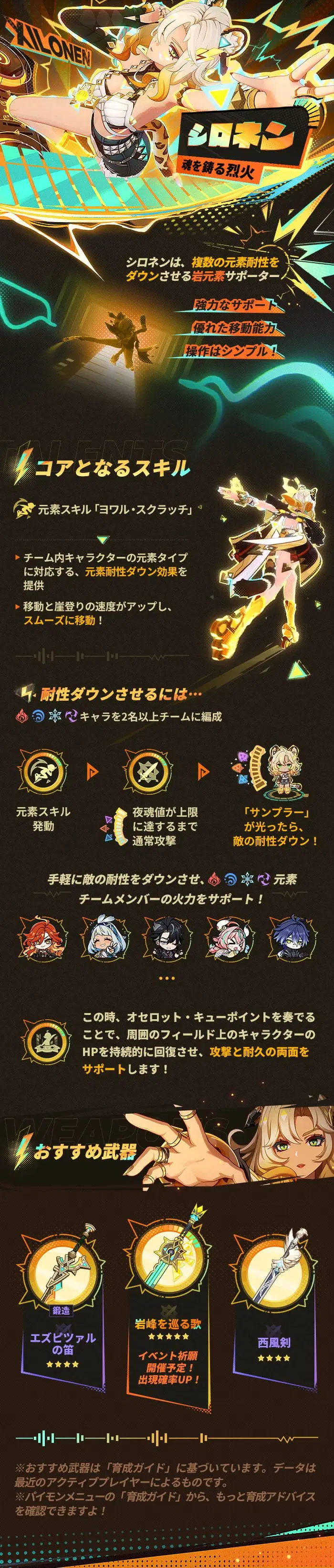 旅人さん、こんにちは!イベント祈願「鍛火の祝福」が12月23日から開催されます。「魂を鋳る烈火・シロネン(岩)」の出現確率が大幅UP! さらに、イベント祈願では「百折不撓の熔岩・イアンサ(雷)」「厳罰を与える法の通暁者・シュヴルーズ(炎)」「頭角を現す駿猊・嘉明(炎)」の出現確率も大幅にUPします! 詳しい情報はこちらから!責任持って物語を伝える人は必要っしょ? |「シロネン」・メモ