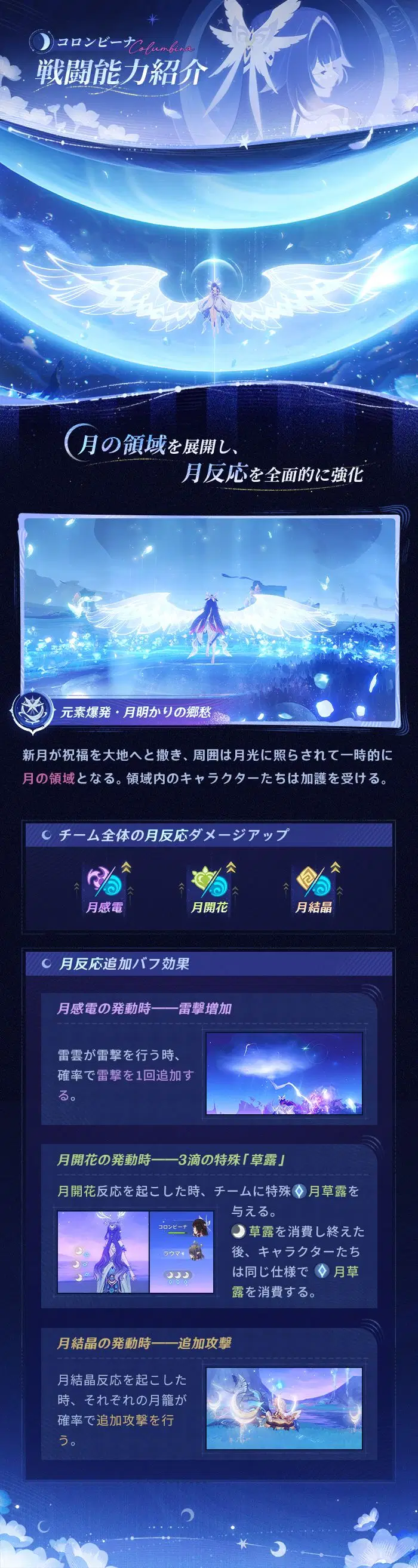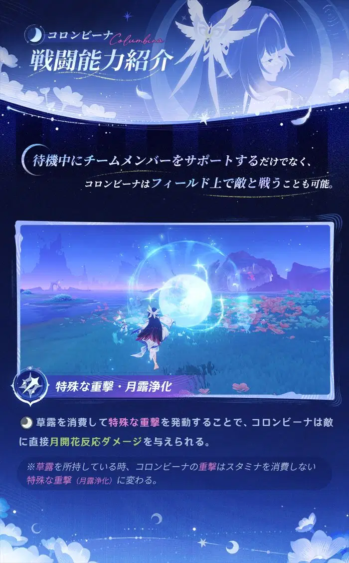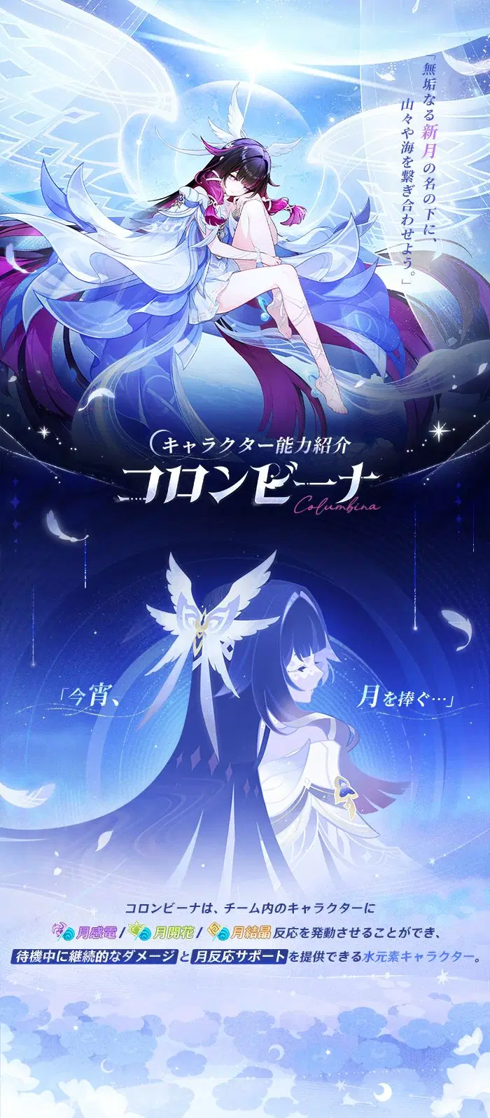 旅人さん、こんにちは!今回はコロンビーナのキャラクター能力紹介を一緒に見ていきましょう!イベント祈願「月と共に眠る」は「Luna Ⅳ」(1月14日)バージョンアップ後に開催され、「空月の帰郷・コロンビーナ」の出現確率が大幅にUPします!