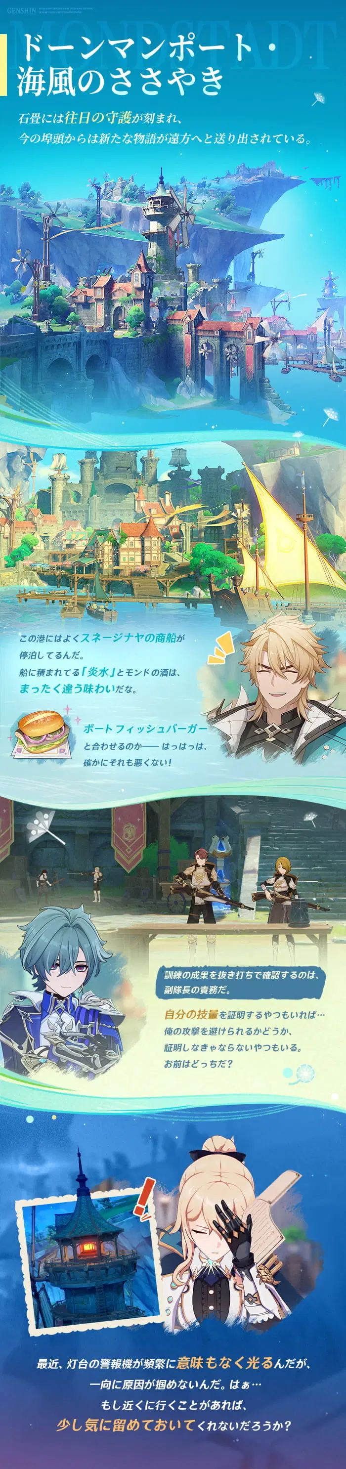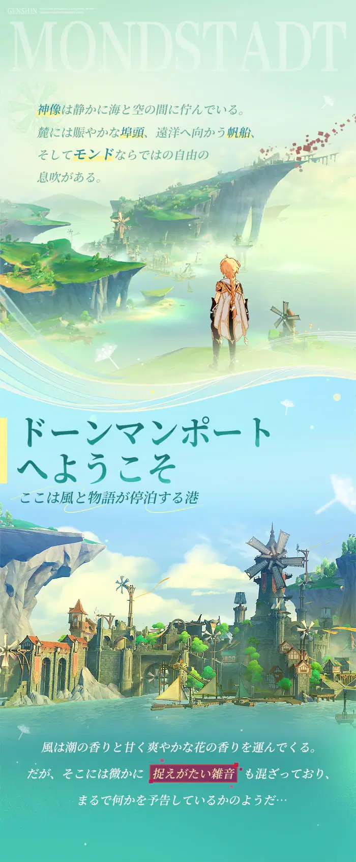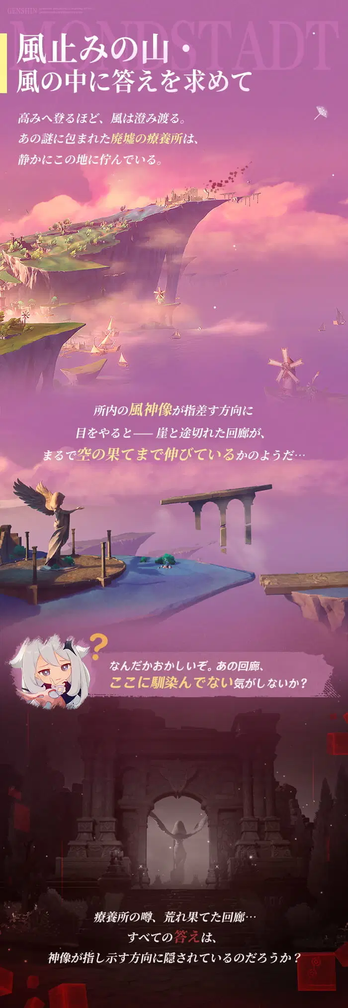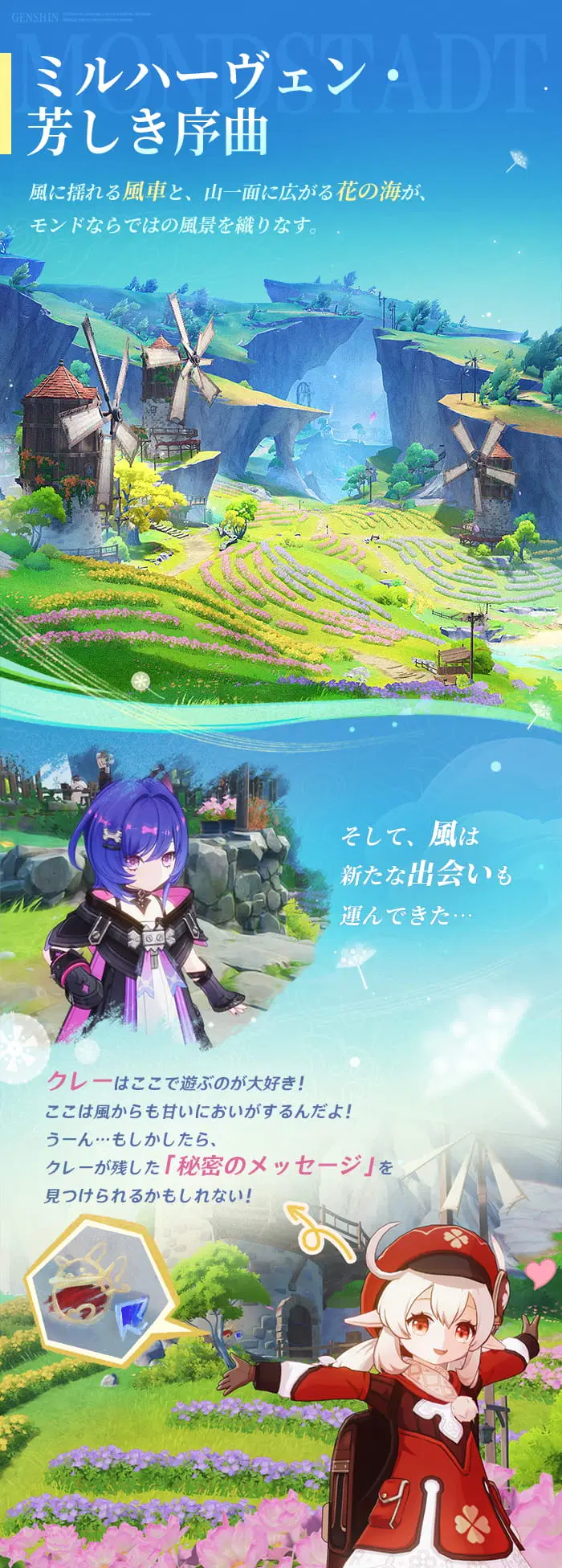 モンドの物語は続き、風が新たな旅への招待状を運んできました。ミルハーヴェンの花の香り、ドーンマンポートの潮風、そして幽霊が出ると噂される廃墟の療養所…
