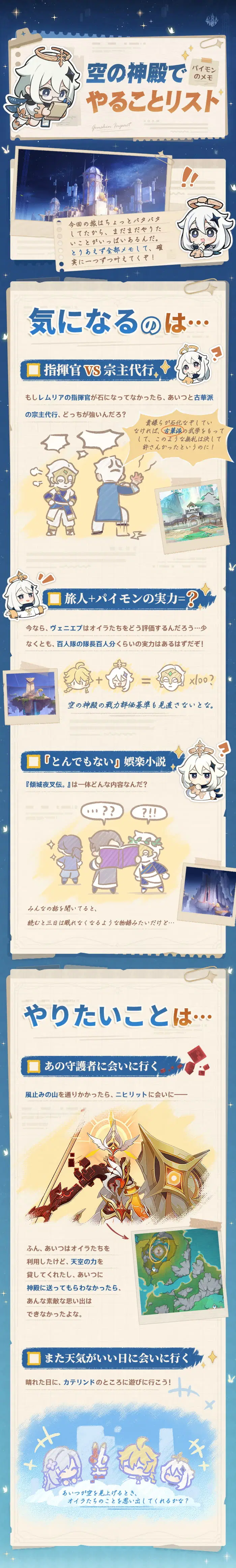 空の神殿から戻った後、パイモンの「やることリスト」にはたくさんの項目が書き加えられていました。一緒に見てみましょう!